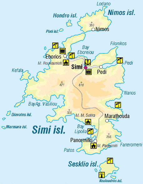 jeden z najkrajších ostrovov Egejského mora (2500 obyv.), na ktorý niekoľkokrát denne priplávajú výletné lode z Rodosu. Zaujímavosti: prístav Symi so storočnými obydliami niekdajších námorných kapitánov a lodiarov, na záp. pobreží sa týči osamelý obrovský Kláštor Panormitis – významný pútnický cieľ gréckych veriacich, zasvätený Archanjelovi Michalovi. Ostrov je známy lovom morských hubiek. Ubytovanie: napr. hotel Aliki – storočný kapitánsky dom s 15 izbami (tel.: , fax: +30-22410-71655), alebo Pedi Beach Hotel (tel.: 71981, fax: 71982).